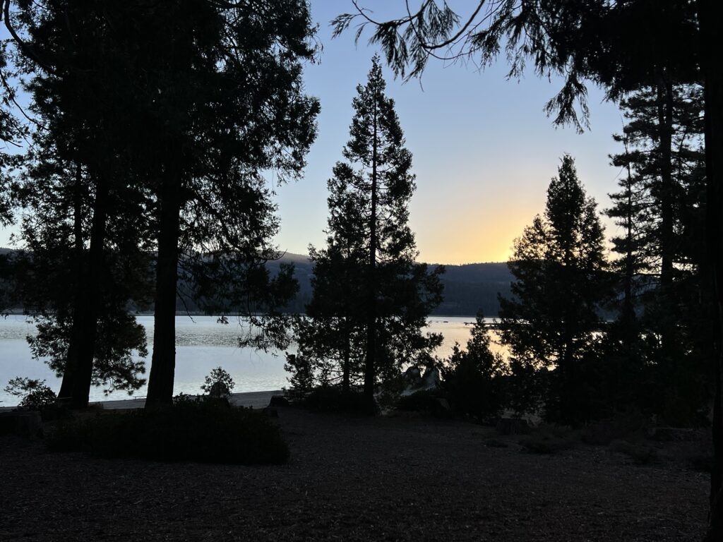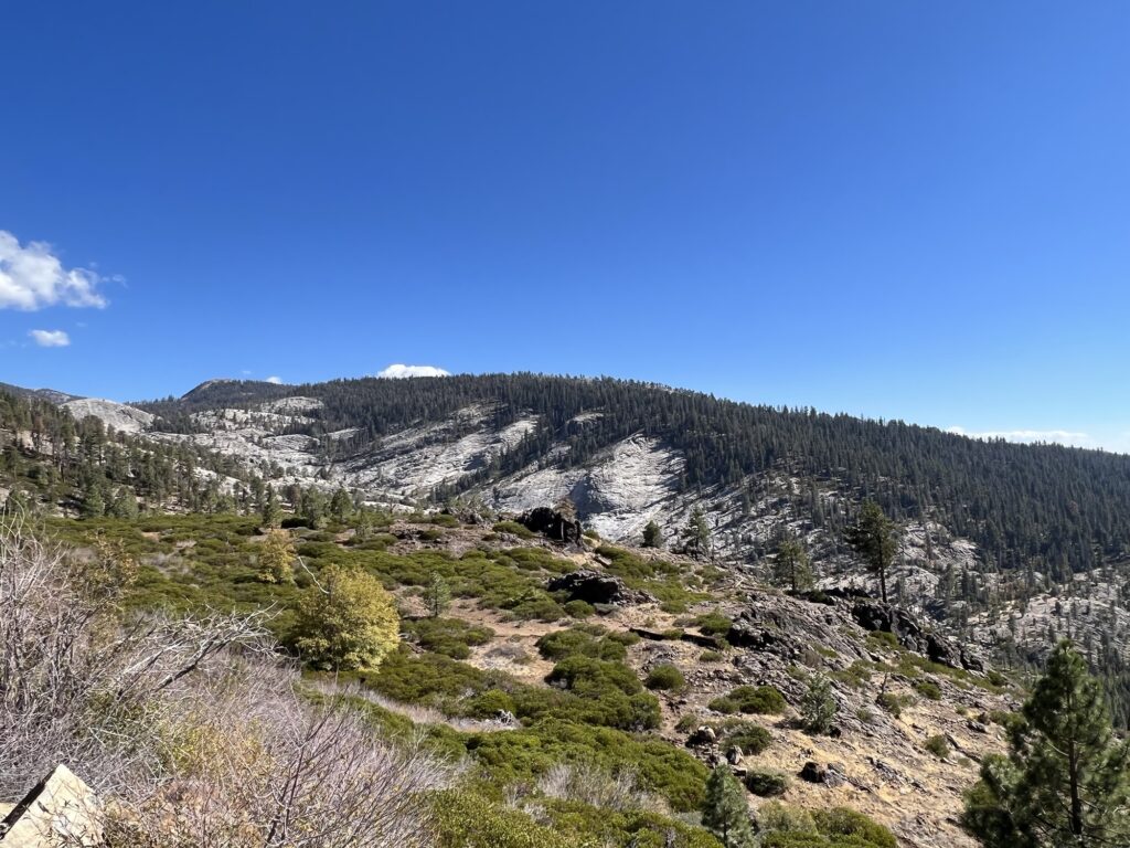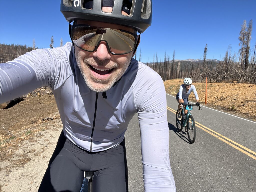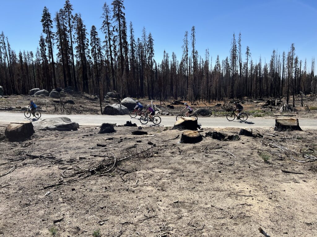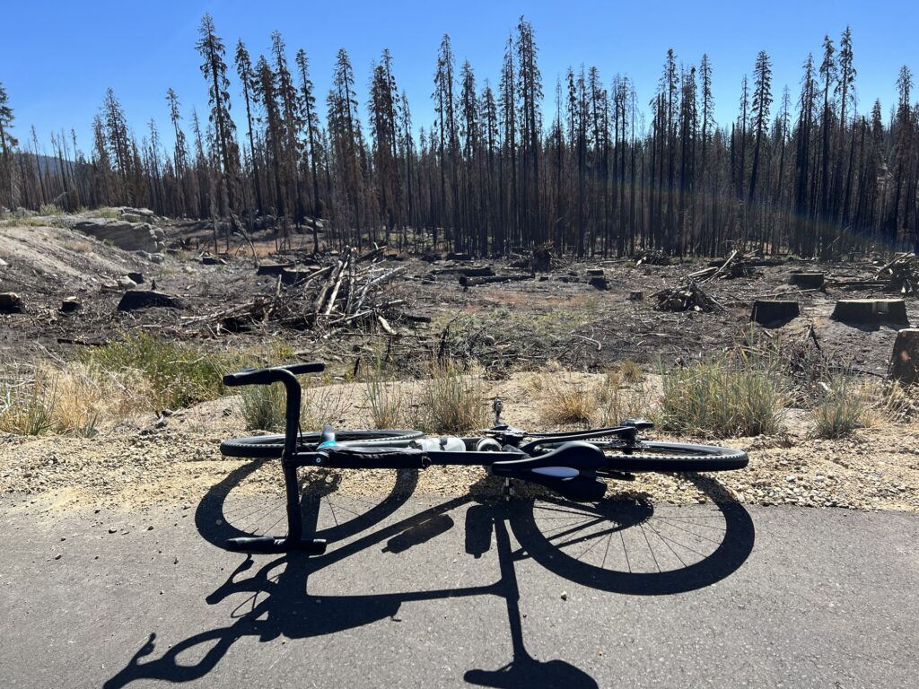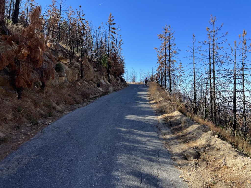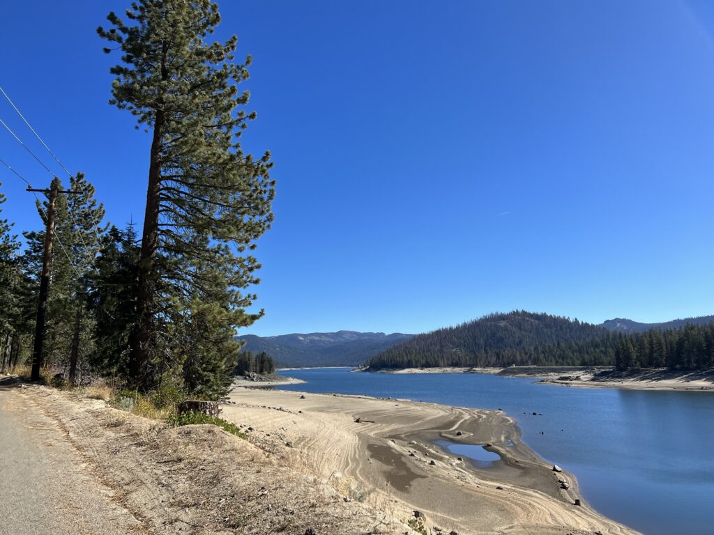 My GPS tracking bonked out early on the timed 10% Big Creek Climb segment, a failed opportunity for cranking out some bragging rights. Up on top of that mountain of granite we got to enjoy a meandering, rolling ride around the Huntington reservoir. Partly very pretty lakeside forest, but much of the eastern shoreline is barren, decimated from the massive 2020 Creek forest fires. Hard to shake the looming feeling of unease and fragility under the massive scale of this place.