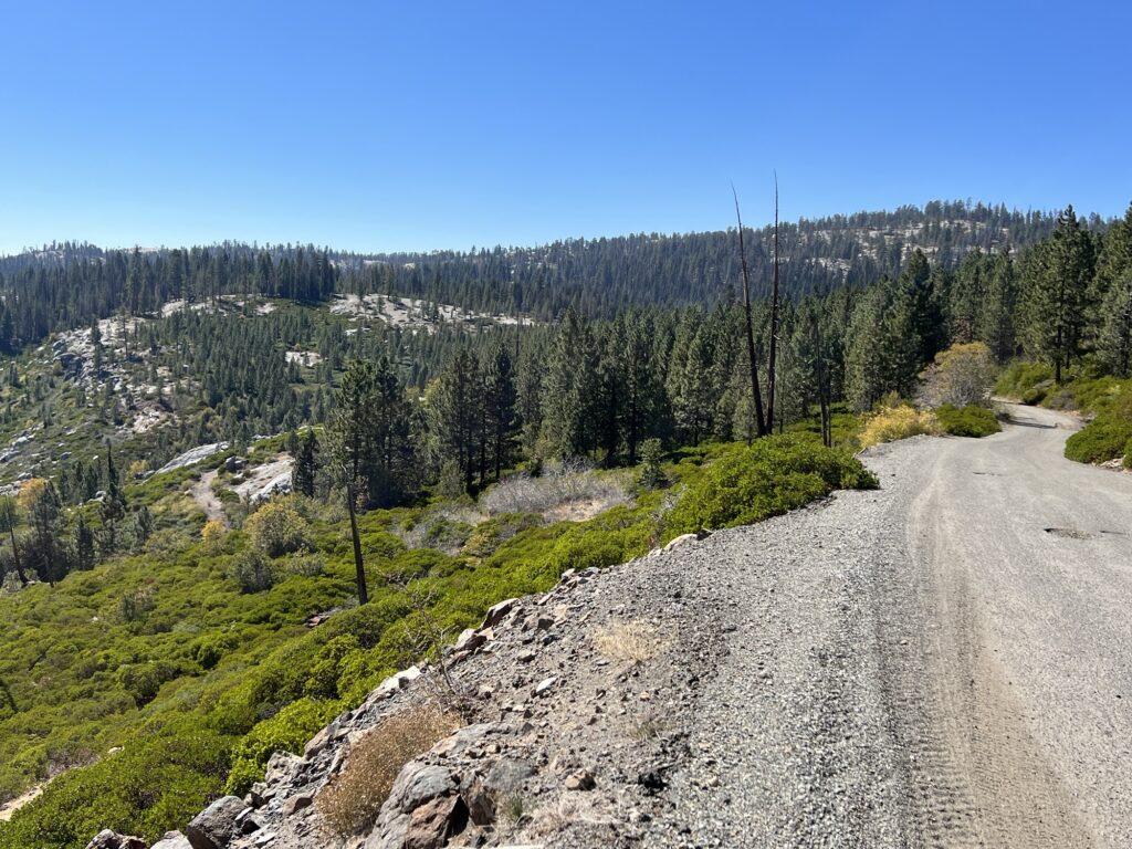 Route is a big clockwise loop from Shaver Lake up and around Huntington Reservoir primarily on high-Sierra pavement with some biggish descents and climbs. There’s a spirited forest-road offshoot from Tamarack down Dinkey Creek. Amongst the spectrum of gravel rigs are many road bikes on slicks.
